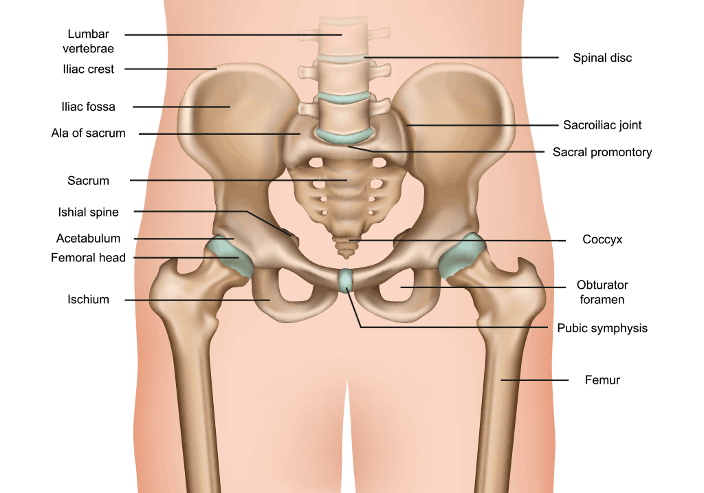 The hip is a ball-and-socket joint that is the point of articulation between the head of the femur (thigh bone) and the acetabulum of the pelvis. The surfaces of the bones at the joint are lined by a smooth and virtually frictionless surface of articular cartilage.